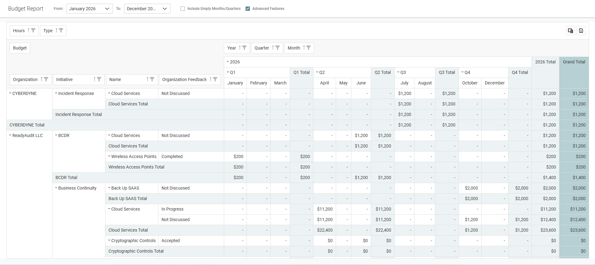 Selecting the Include Empty Months/Quarters checkbox at the to of the page displays all months and quarters for organizations that have budgeted items within the selected month/year timeframe, even if some periods do not have a budget. No budget is denoted by a hyphen -.