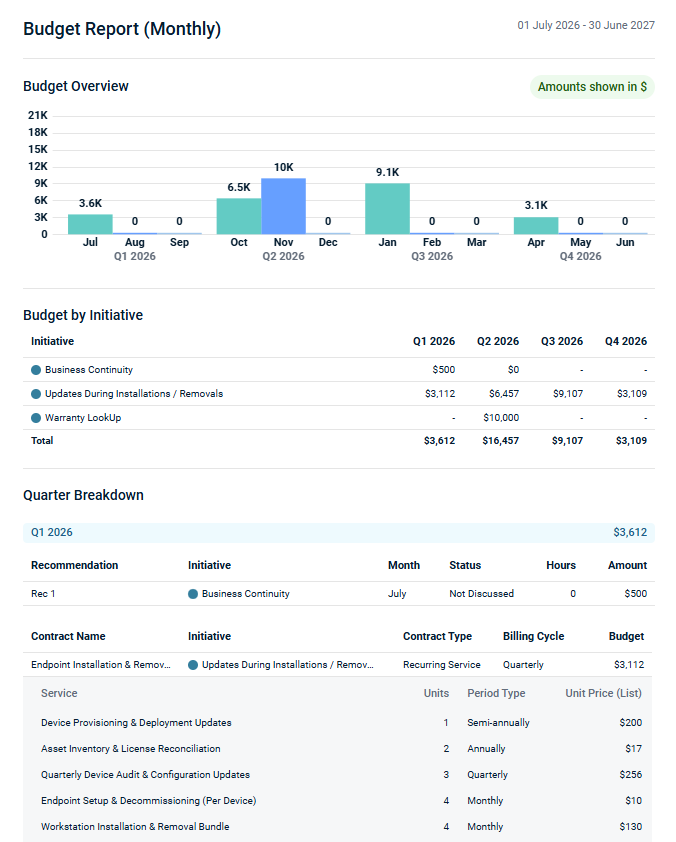 The Budget Report section in the QBR Report Builder allows you to present a budget view for an individual organization based on its Strategic Roadmap recommendations and contracts within QBR reports.